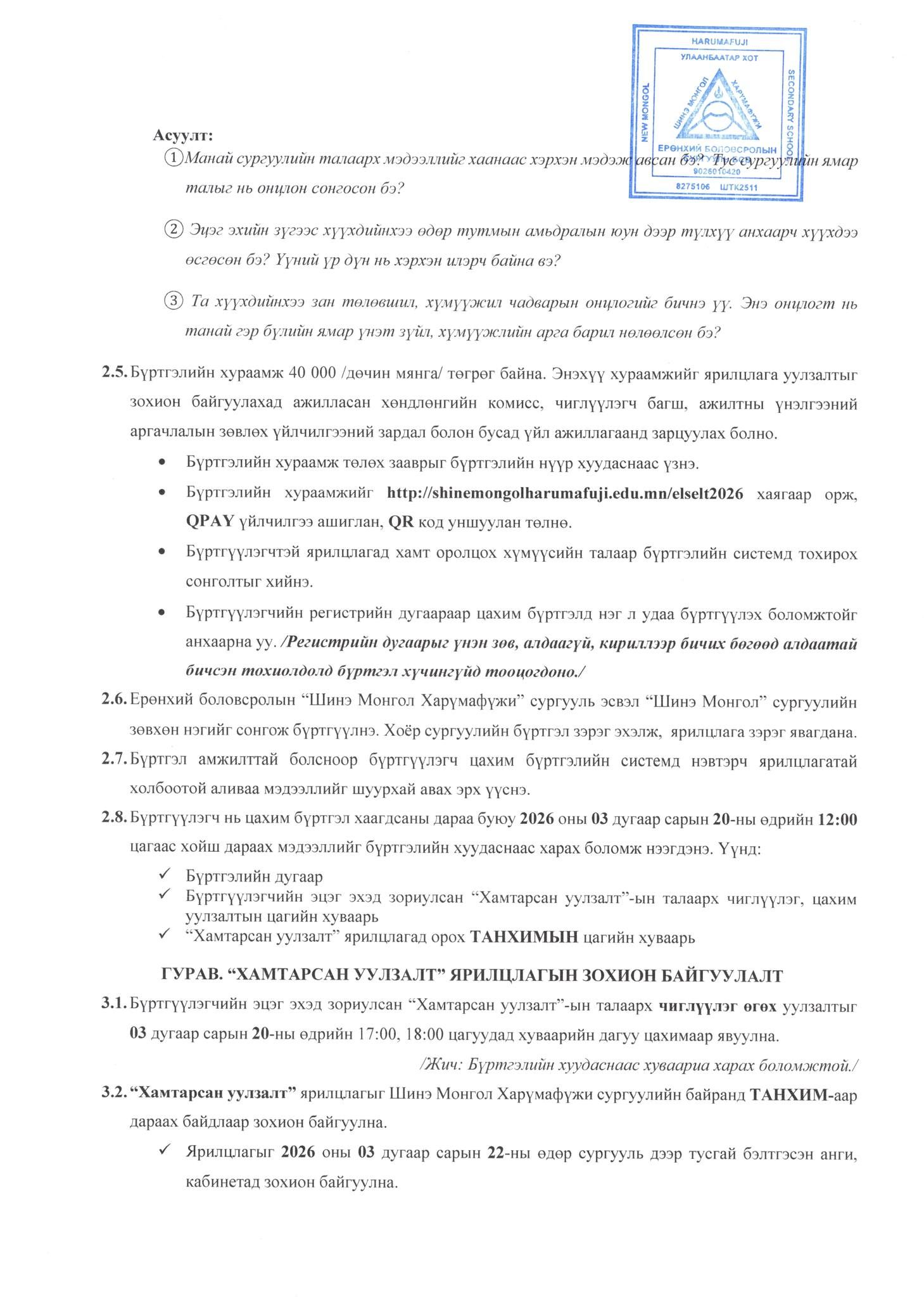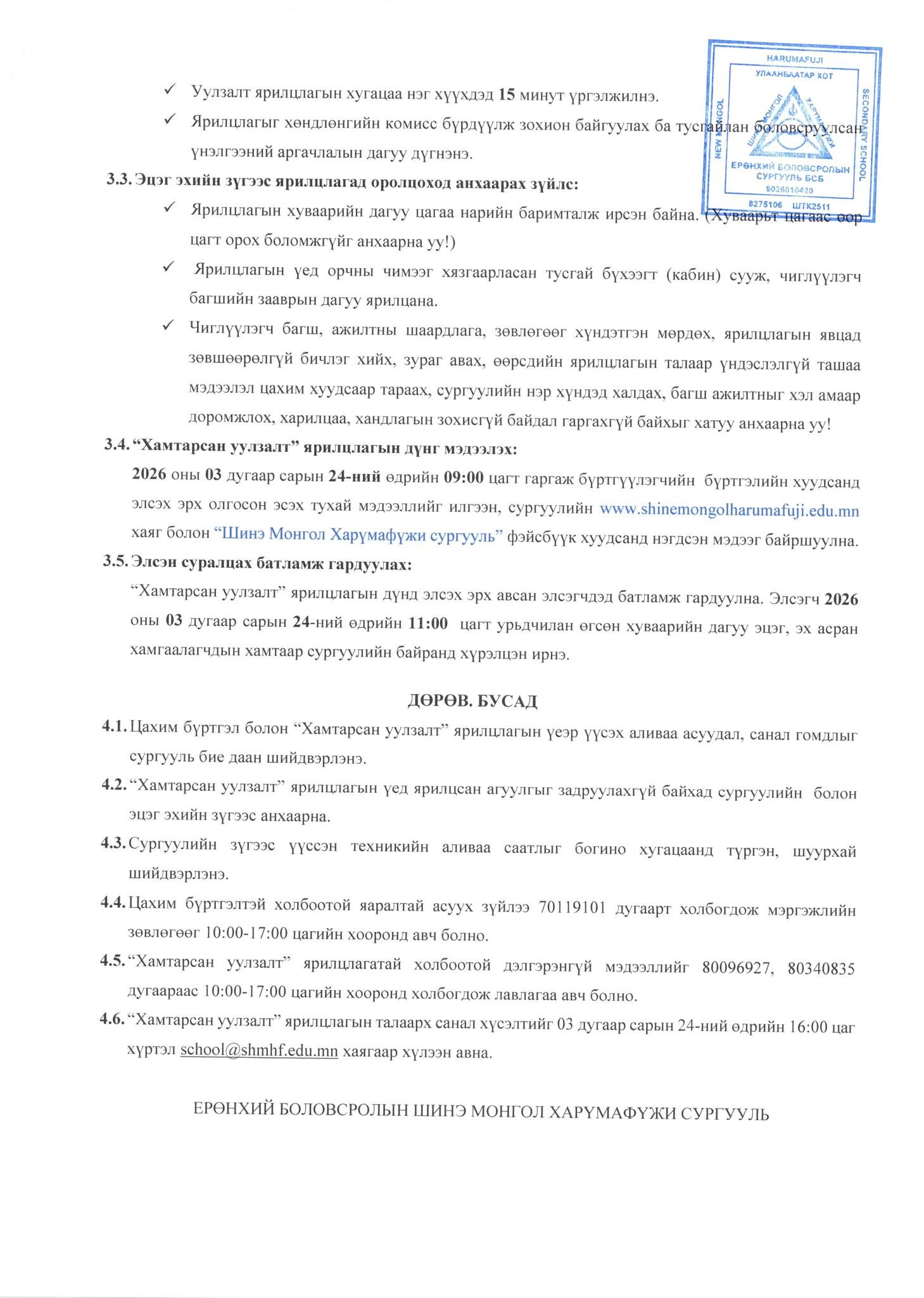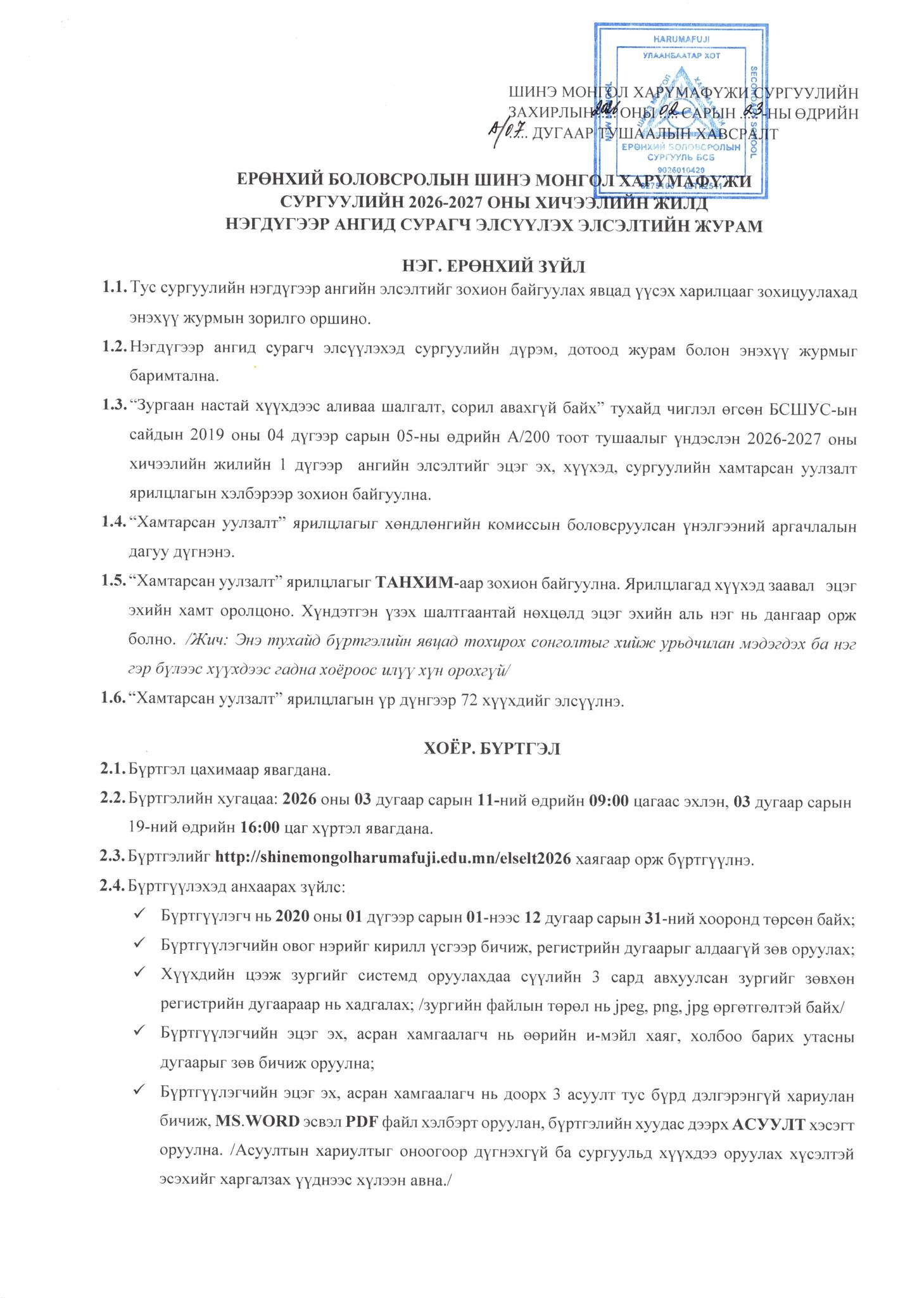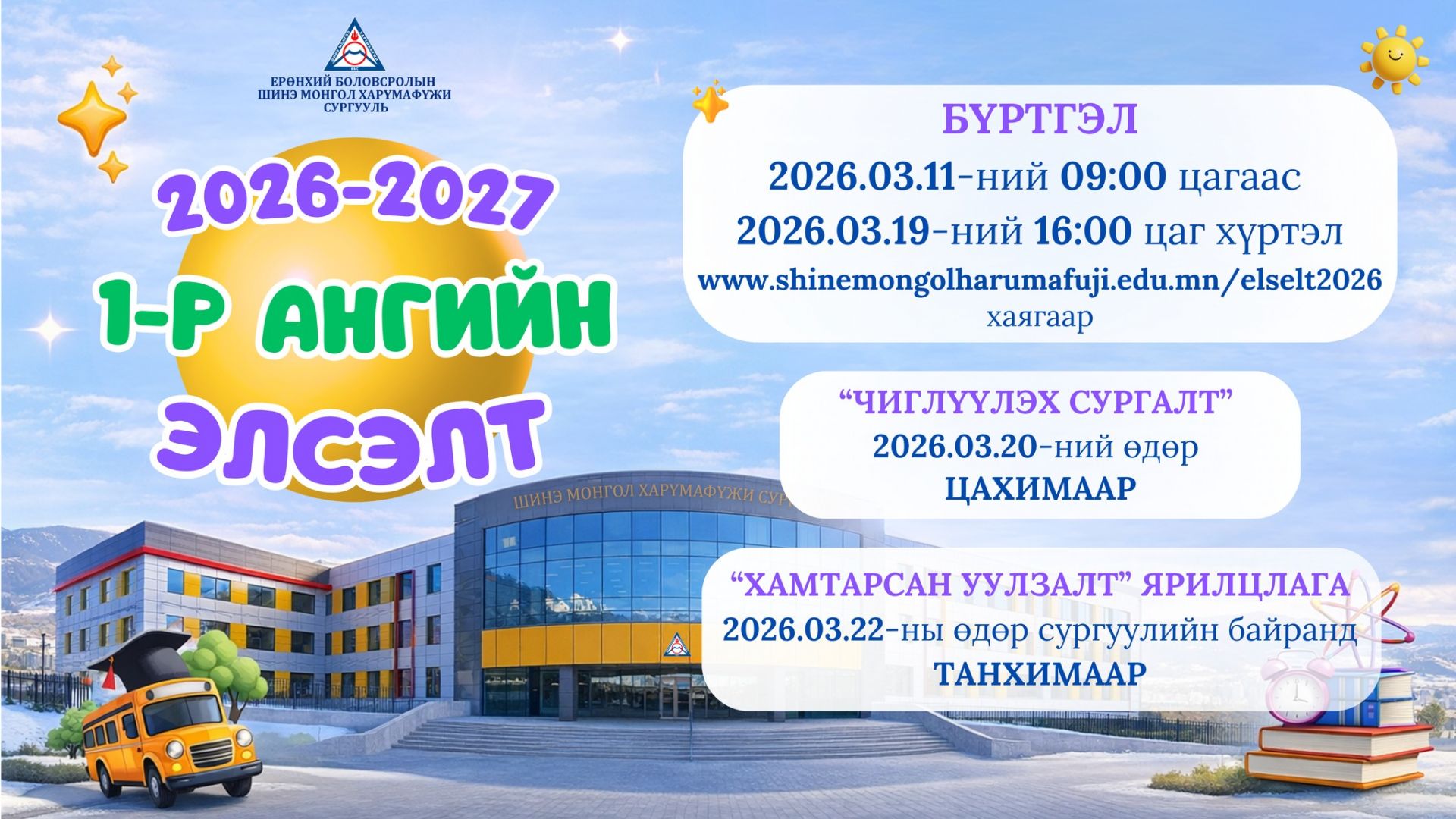 Бүртгэл 2026.03.11-ний 09:00 цагаас 2026.03.19-ний 16:00 цаг хүртэл